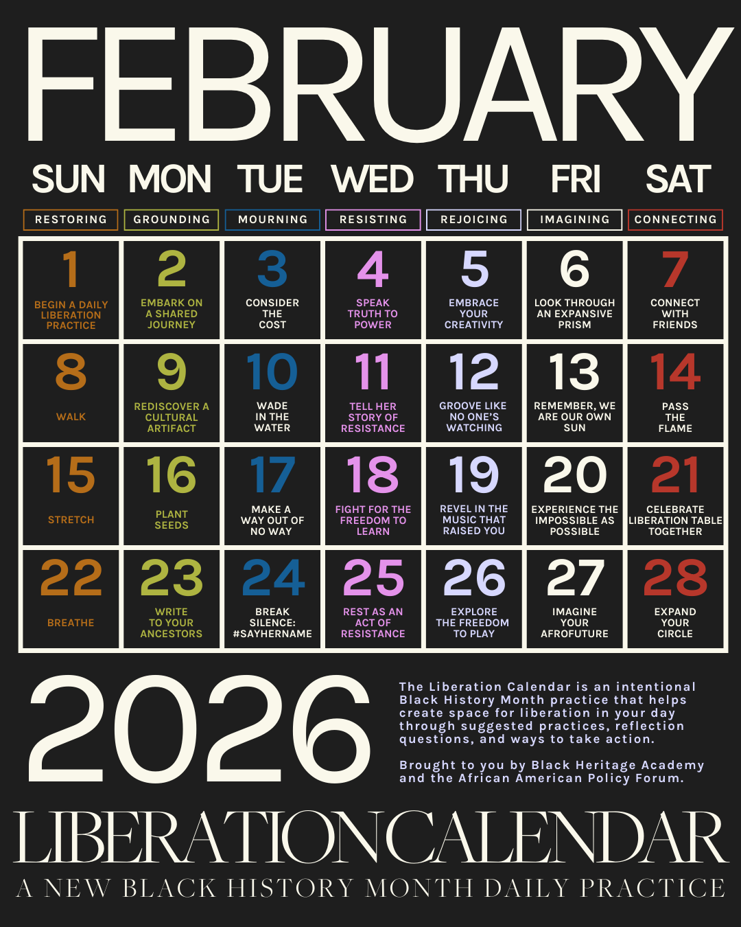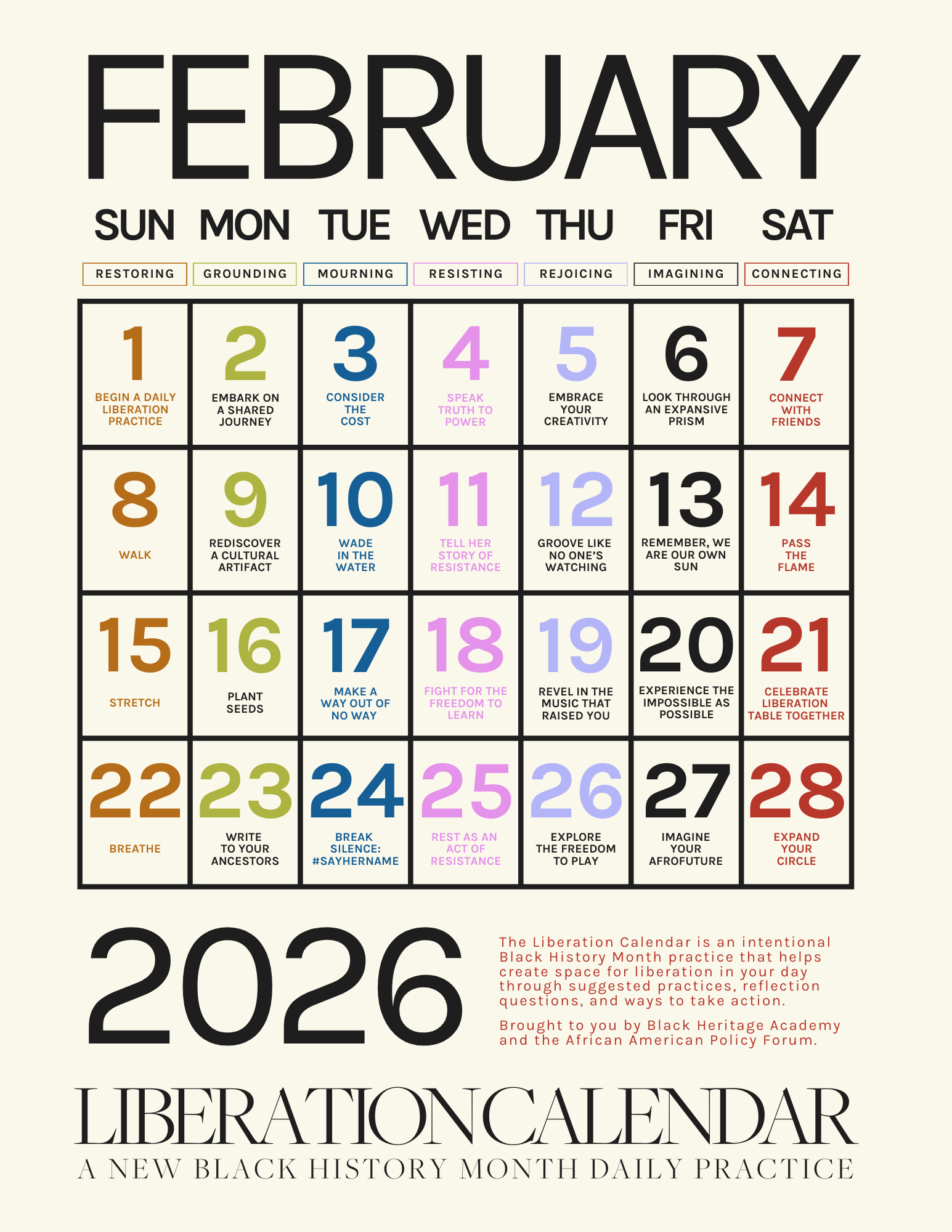 We are thrilled to bring you the 2026 Liberation Calendar, a partnership of Black Heritage Academy and the African American Policy Forum. The Liberation Calendar will guide you through an intentional Black History Month practice. Each day, you’ll receive an email with a suggested practice, opportunities for reflection, and calls to action.